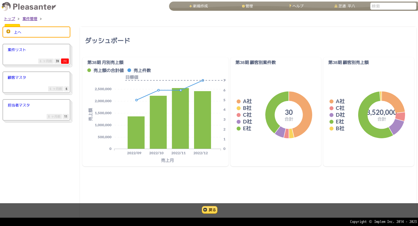 「案件管理」内の画面をカスタマイズして、このインラインフレームを埋め込むことによって、プリザンター上で「Metabase」のグラフが表示されるようになり、月ごとの売上や顧客ごとの案件数、売上額などを可視化することができるようになりました。