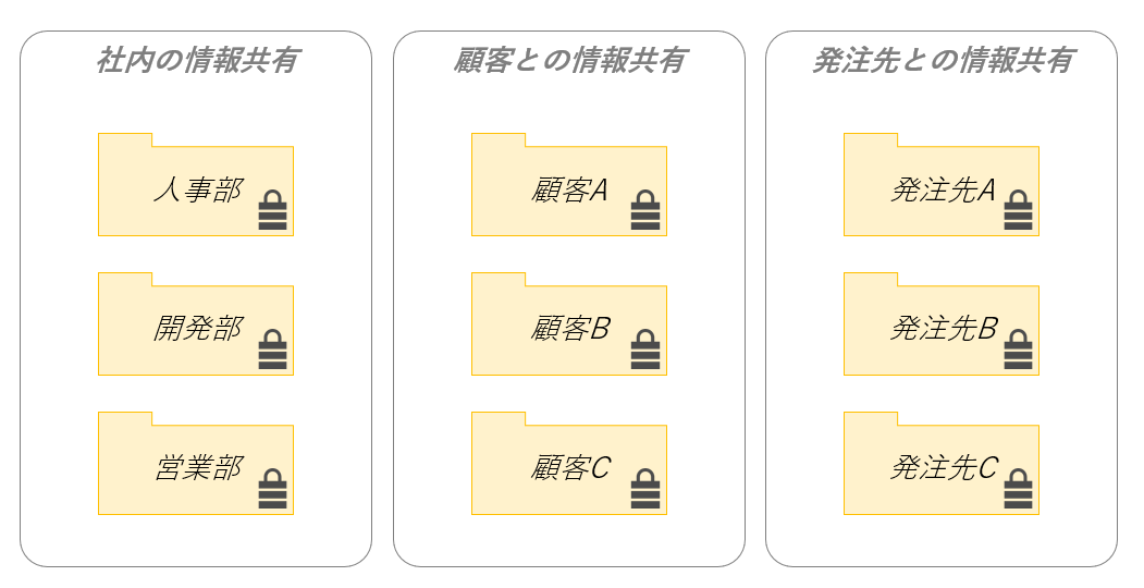 フォルダ単位にアクセス制御が行えるため、社内の情報共有だけでなく顧客や発注先との情報共有にも活用できます。