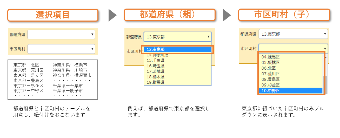 項目連携機能により、分類に親子関係がある場合、親分類項目の選択値に対応した子分類項目が自動的に切り替わります。