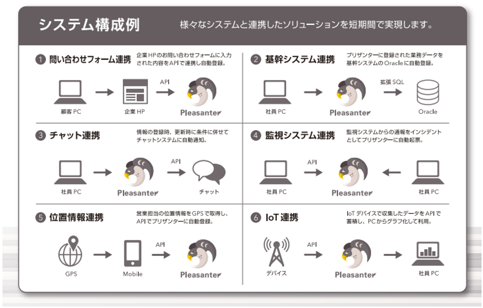 APIによるシステム間の連携も可能です。会社のホームページから問い合わせデータを連携したり、
