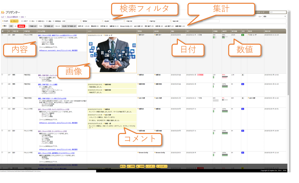 一覧画面では、数値や日付等のデータだけでなく、コミュニケーションに役立つコメント情報や画像など