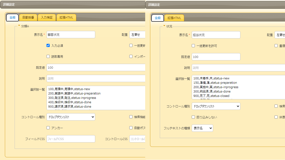 案件のステータスを表す「顧客状況」や「担当状況」については、実情に合った形で選択肢一覧を変更しました。