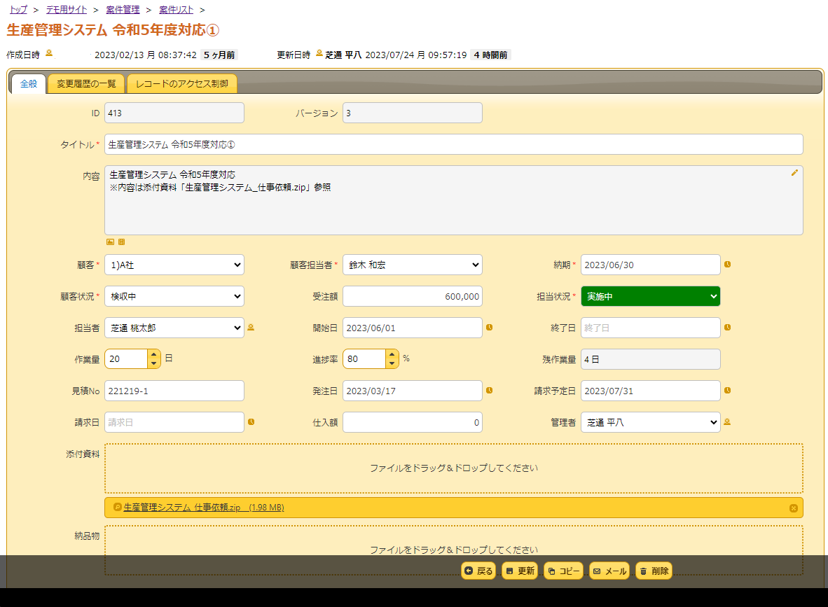 その後、実際に業務を行う中であった方が良さそうな項目(顧客担当者、顧客状況、進捗率、添付資料、納品物など)を必要に応じて追加していきました。